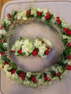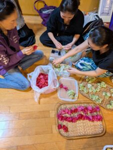 お客様に差し上げる花にピンをつけ、さーショーの準備完了!
