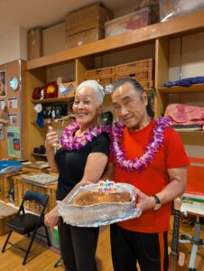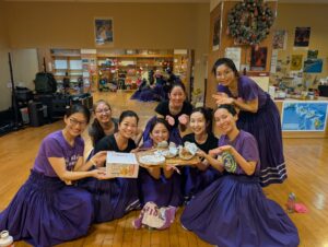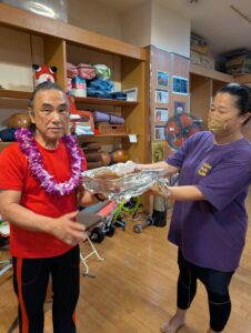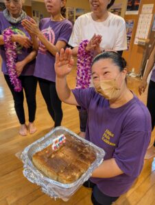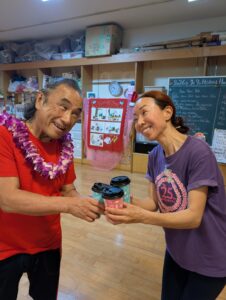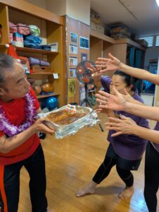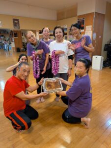 ビギナーのクラスの先輩達は、新しく入ったミチヨさんとヨ―コさんにLeiを
